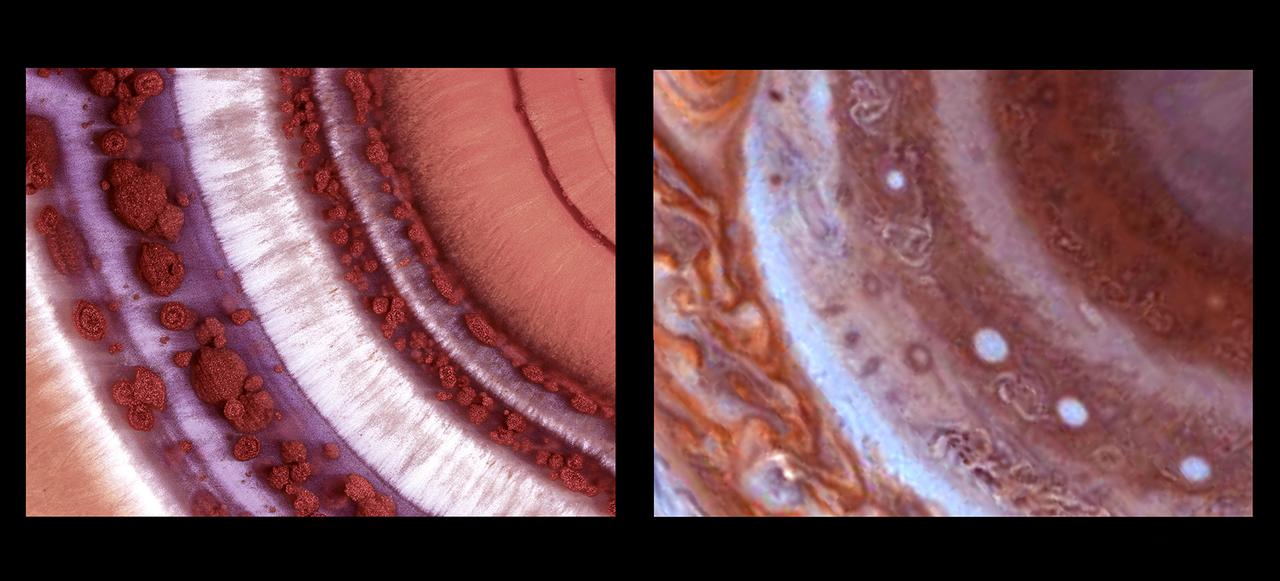 Подібність науковці розгледіли й у полірованому фрагменті агату (зліва) та атмосферних потоках на Юпітері, які зафіксував апарат «Кассіні» (справа).