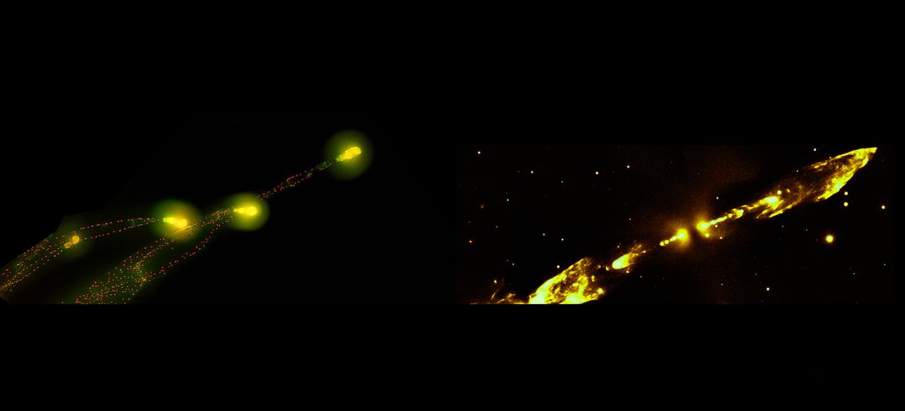 Зліва — паросток тютюну, який генетично модифікували для синтезу жовтого барвника, що світиться в ультрафіолеті. Справа — народження зорі, що викидає два джети газу та пилу.