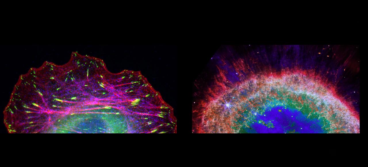 Зліва — людські клітини раку кісток під флуоресцентним мікроскопом. Справа — знімок планетарної туманності, зроблений космічним телескопом «Джеймс Вебб».