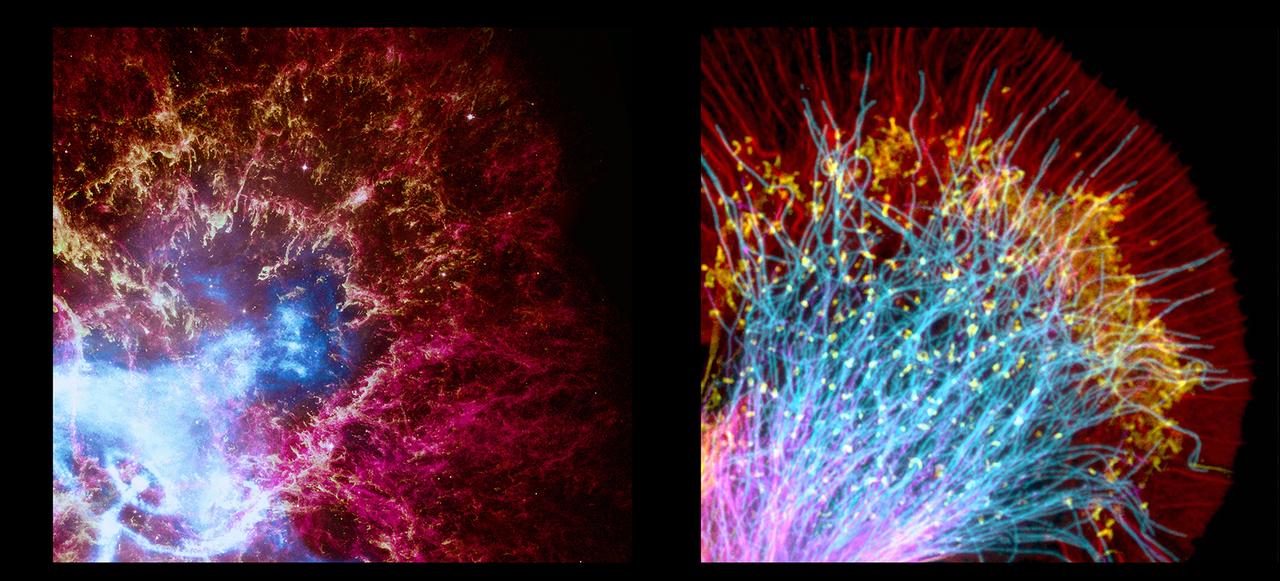 Зліва — Крабоподібна туманність, що утворилася внаслідок вибуху масивної наднової у 1054 році. Справа — нервова клітина морського слимака, сфотографована за допомогою конфокального мікроскопа з великою роздільною здатністю.
