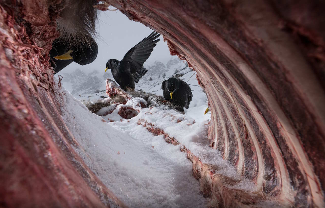 На висоті понад 2500 метрів над рівнем моря в Альпах італійський фотограф протягом декількох днів спостерігав за тваринами, які приходили поживитися рештками гірського козла. Нарешті йому вдалося зробити знімок того, як замикається коло життя — птахи-падальники живляться мертвою твариною, щоб підтримати власне життя на такій висоті.