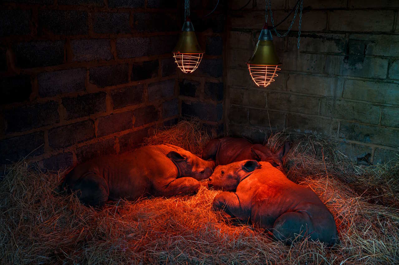 Інше фото з цієї ж категорії показує трьох осиротілих дитинчат південних білих носорогів на колись найбільшій фермі цих тварин у Південноафриканській Республіці. Коли вони стануть достатньо самостійними, дитинчат випустять у дику природу.