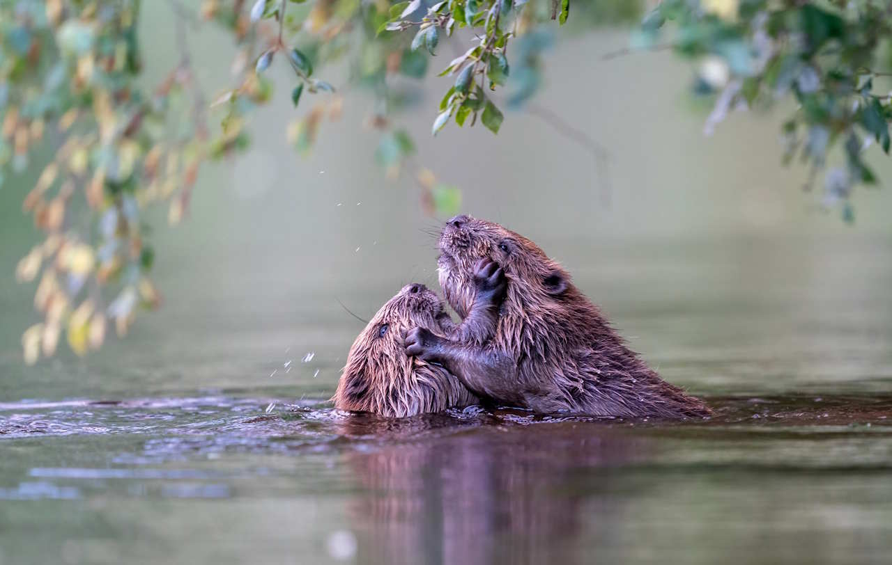 Норвезькому ж фотографу вдалося зазнимкувати набагато більш мирну сцену: в лісовому озері двоє бобрів обіймалися та чистили хутро одне одного кігтями. Імовірно, дві особини готувалися до спарювання чи ж уже утворили пару.