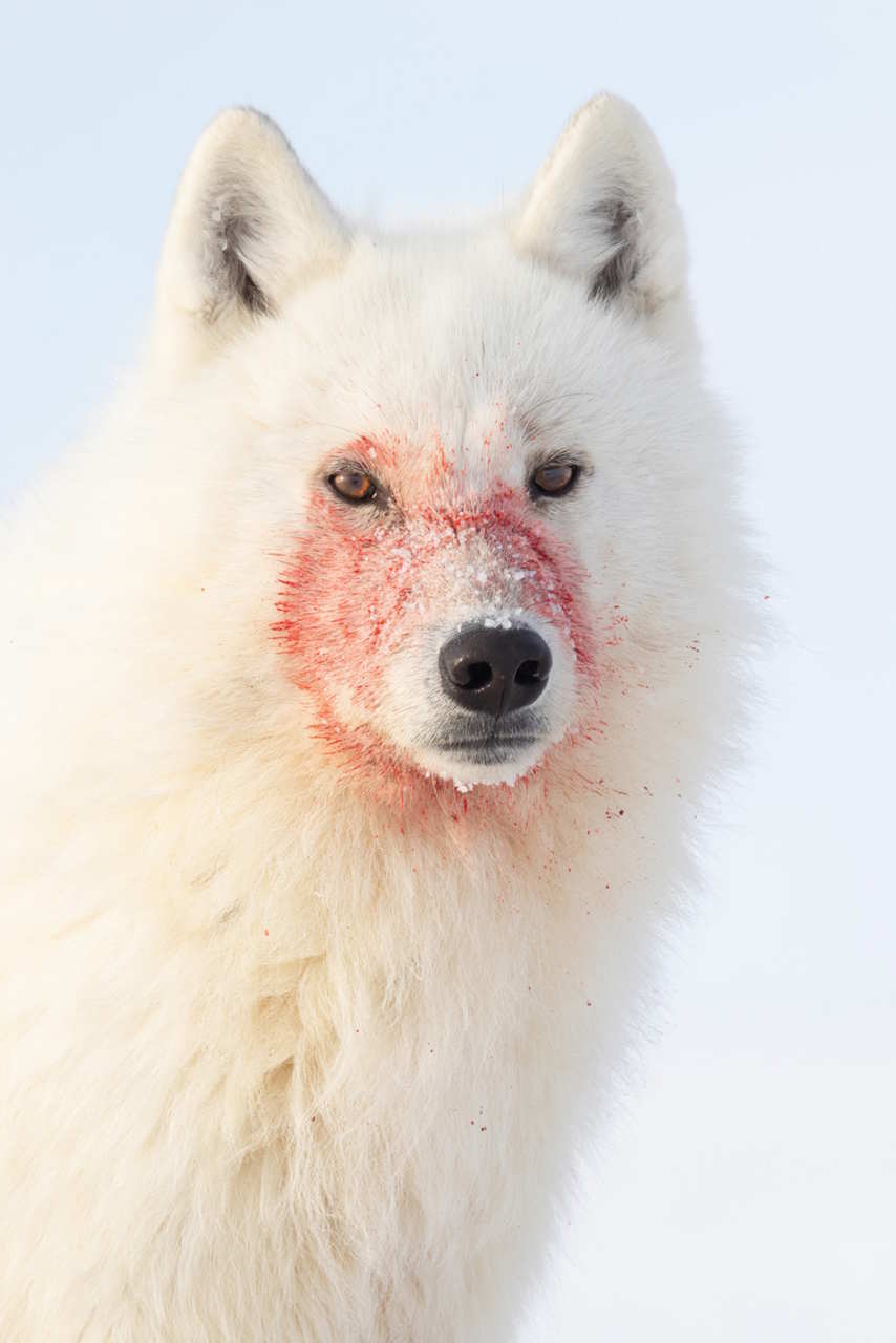 У Канаді фотографу вдалося стати свідком полювання зграї арктичних вовків на трьох новонароджених вівцебиків. Лише кров на морді молодого вовка вказує на його причетність до такого жорстокого полювання.