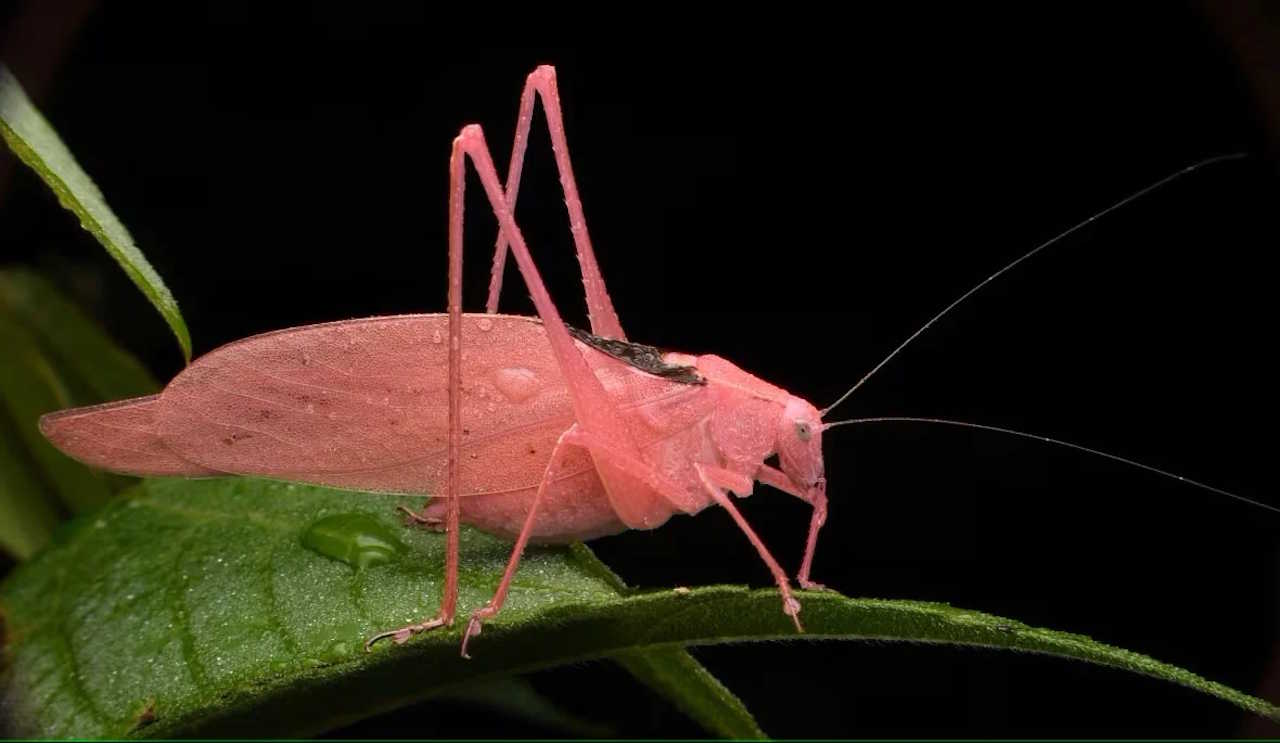 Цього яскравого коника сфотографували в канадському Онтаріо. Зазвичай ці комахи мають зелений колір, але внаслідок генетичної мутації зустрічаються і рожеві особини, що в науці зветься «еритризм». Трапляється таке нечасто, приблизно раз на 500 коників. Деякі науковці вважають, що рожеве забарвлення допомагає комахам виживати серед яскравих квітів, однак інші дослідники вказують на те, що такі особини мають вищий ризик бути з’їденими на своєму переважно зеленому середовищі.