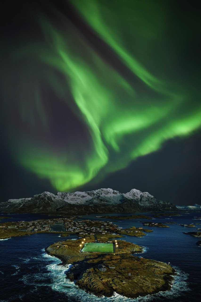 Футбольне поле на норвезькому острові під час полярного сяйва