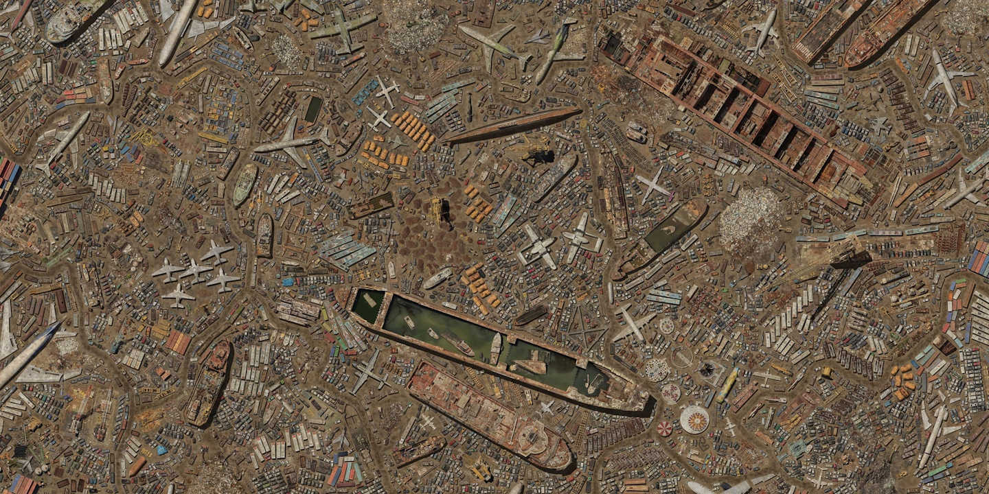Збірка з аерофотографій літаків і кораблів, яка представляє вплив транспорту на Землю