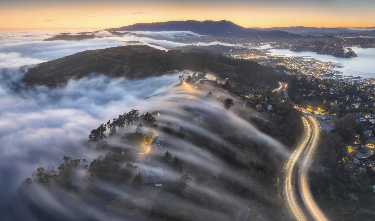 Захід сонця, під час якого туман з узбережжя поступово затягує освітлену трасу