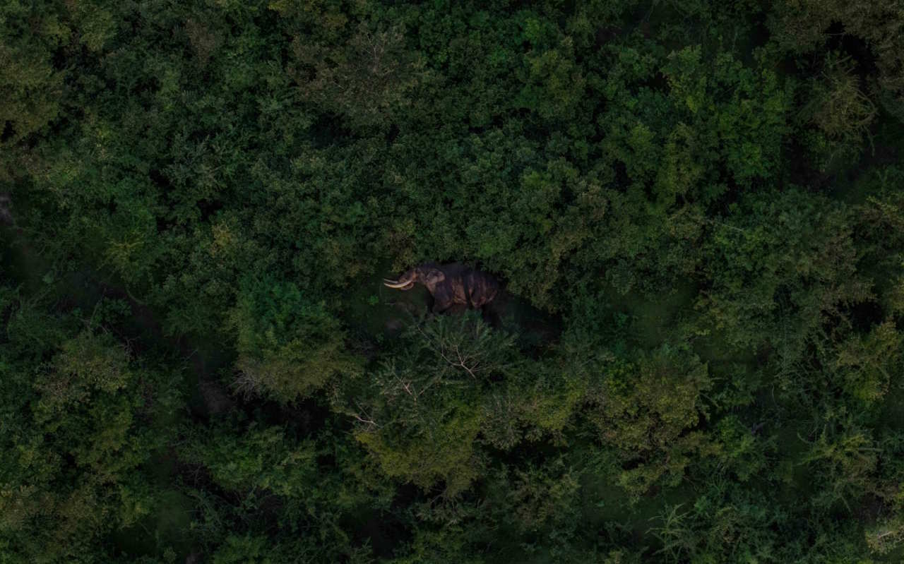 Гігантський шрі-ланкійський слон із масивними бивнями спокійно дрімає в джунглях. З висоти здається, що ліс огортає його, мов колиска — коротка мить тиші для виду, що дедалі частіше опиняється під загрозою.