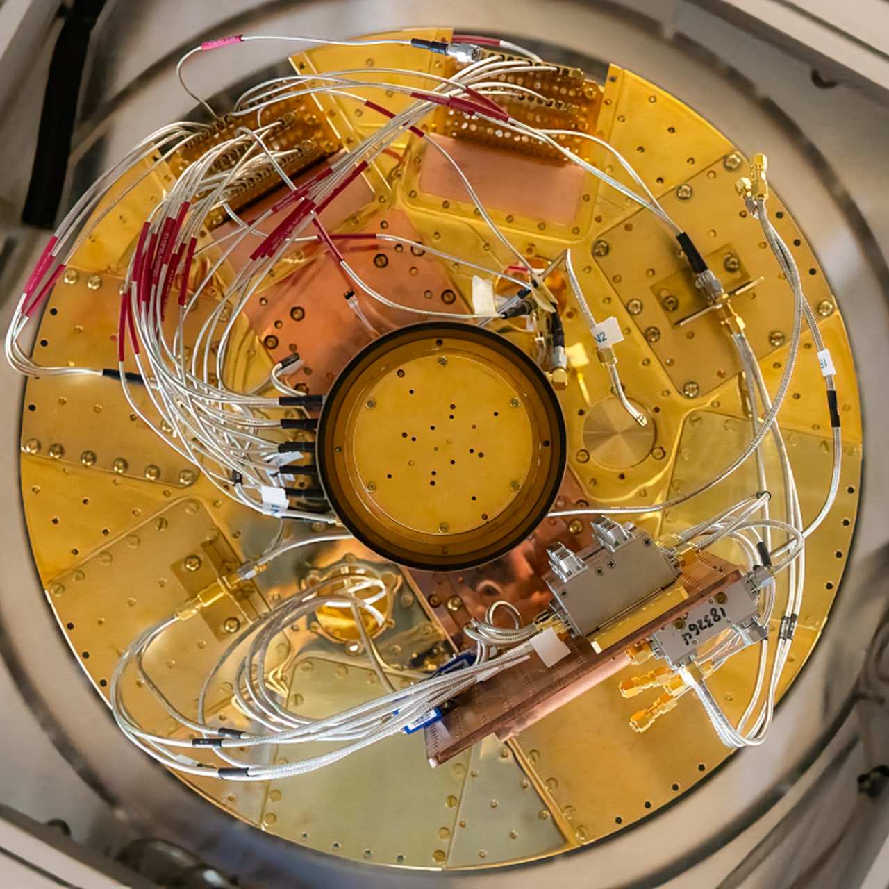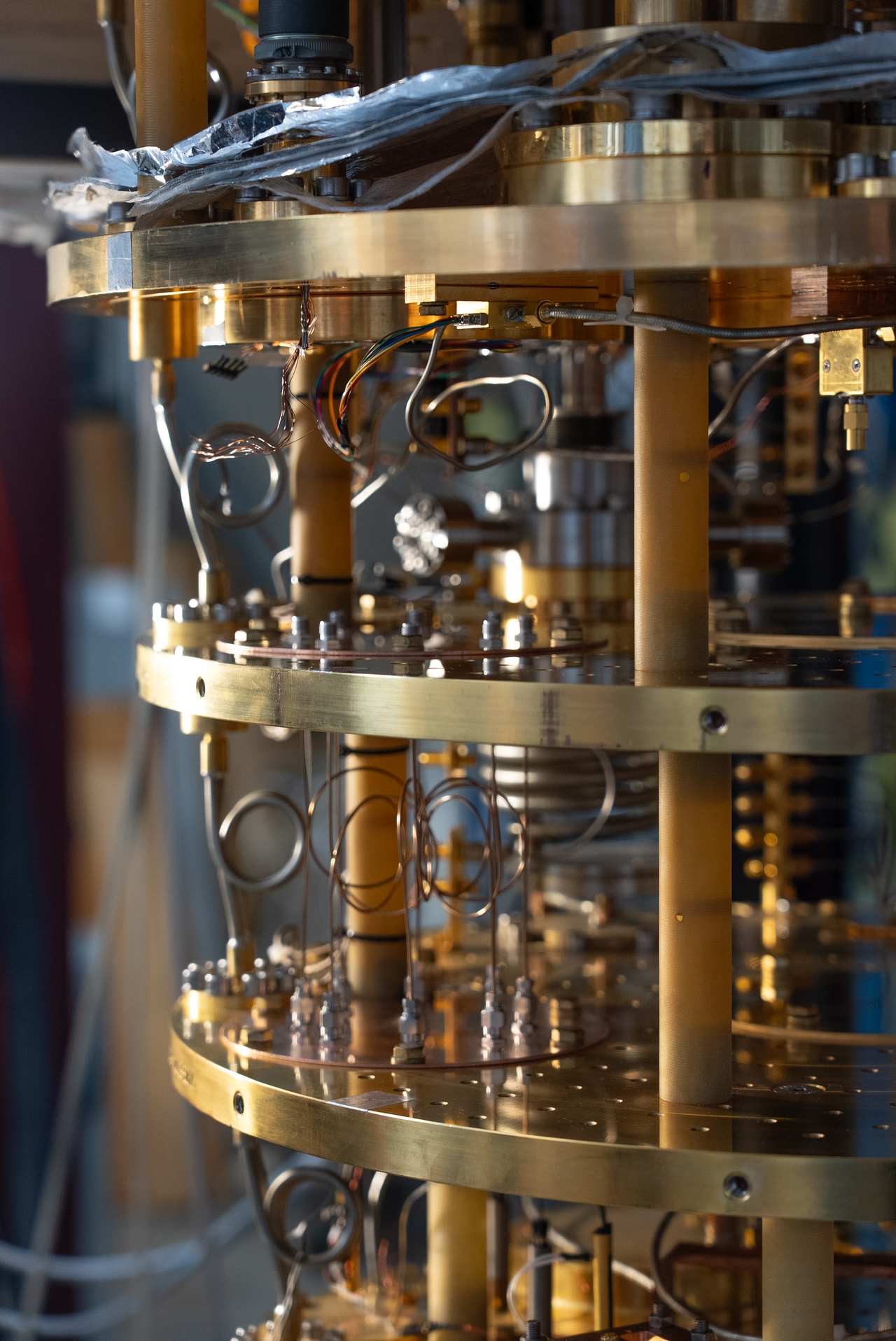 Золоті нутрощі квантового комп’ютера в дослідницькому центрі Fermilab у США, які можна побачити, коли від комп’ютера від’єднують охолоджувальне обладнання.