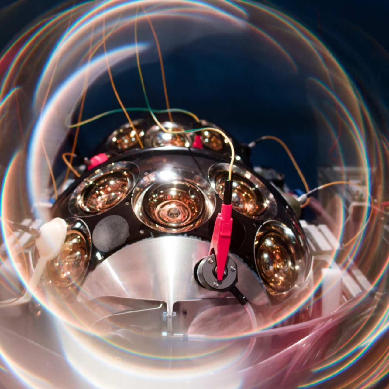 Погляд зблизька на один із детекторів Нейтринного телескопа об'ємом кубічний кілометр. Він обладнаний 31 трубкою, яка підсилює світло, що виникає від взаємодії нейтрино з чутливою рідиною.