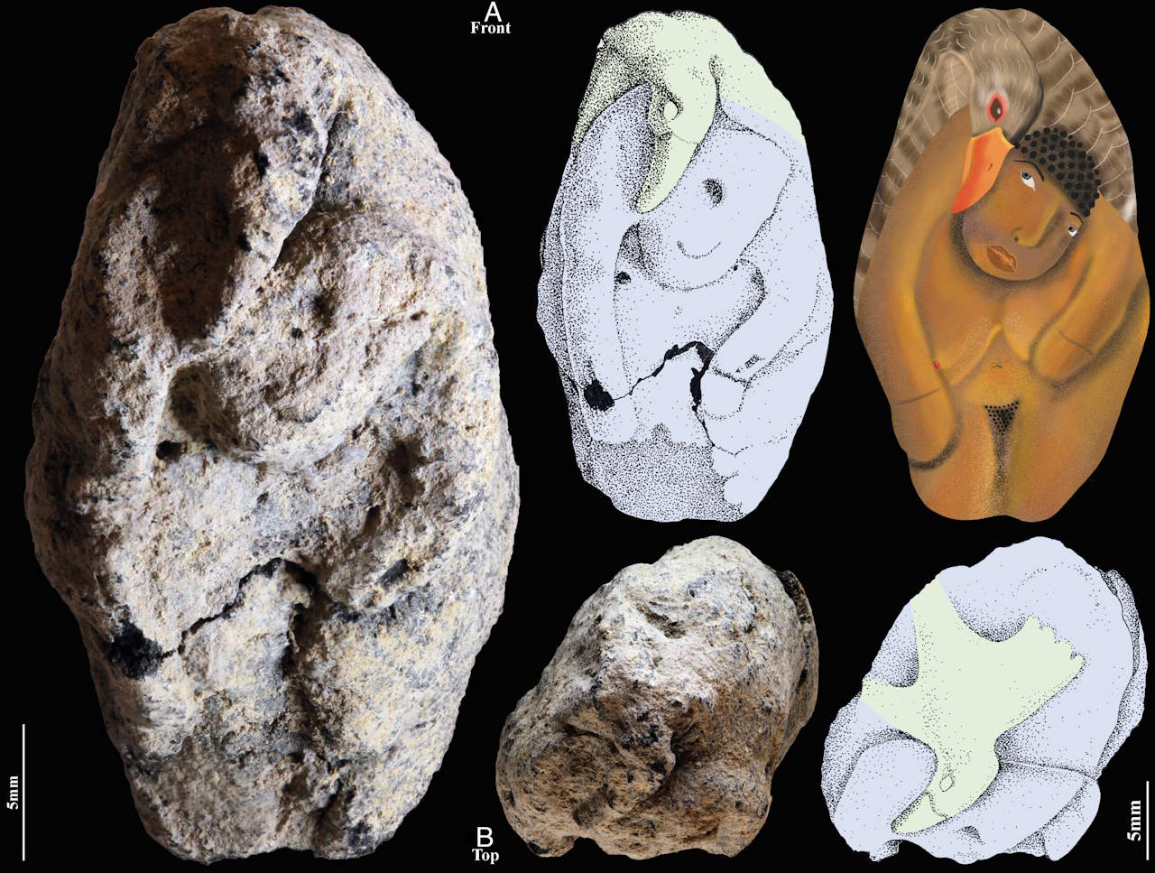 Фото фігурки спереду та згори, а також схематичні зображення жінки та гусака, яких на ній відтворили. Laurent Davin, Vic Oh / Davin et al. / PNAS, 2025