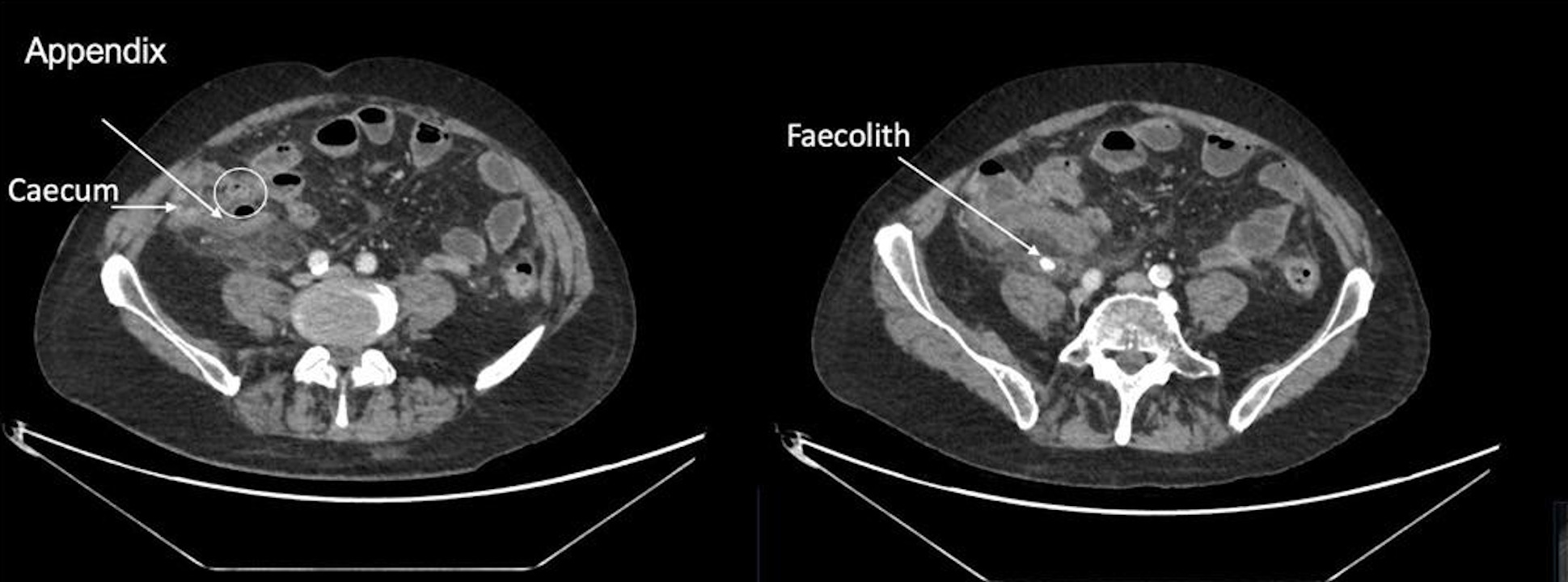 Комп'ютерна томографія апендициту в чоловіка та феколіта — каменя з калу. Kasim et al. / BMJ Case Reports, 2025