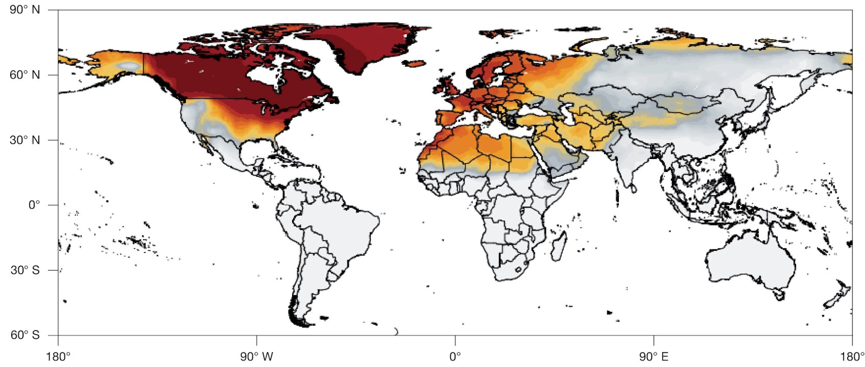 Регіони світу, у яких вплив диму від канадських пожеж був найбільшим, позначені темнішим червоним кольором. Zhang et al. / Nature, 2025