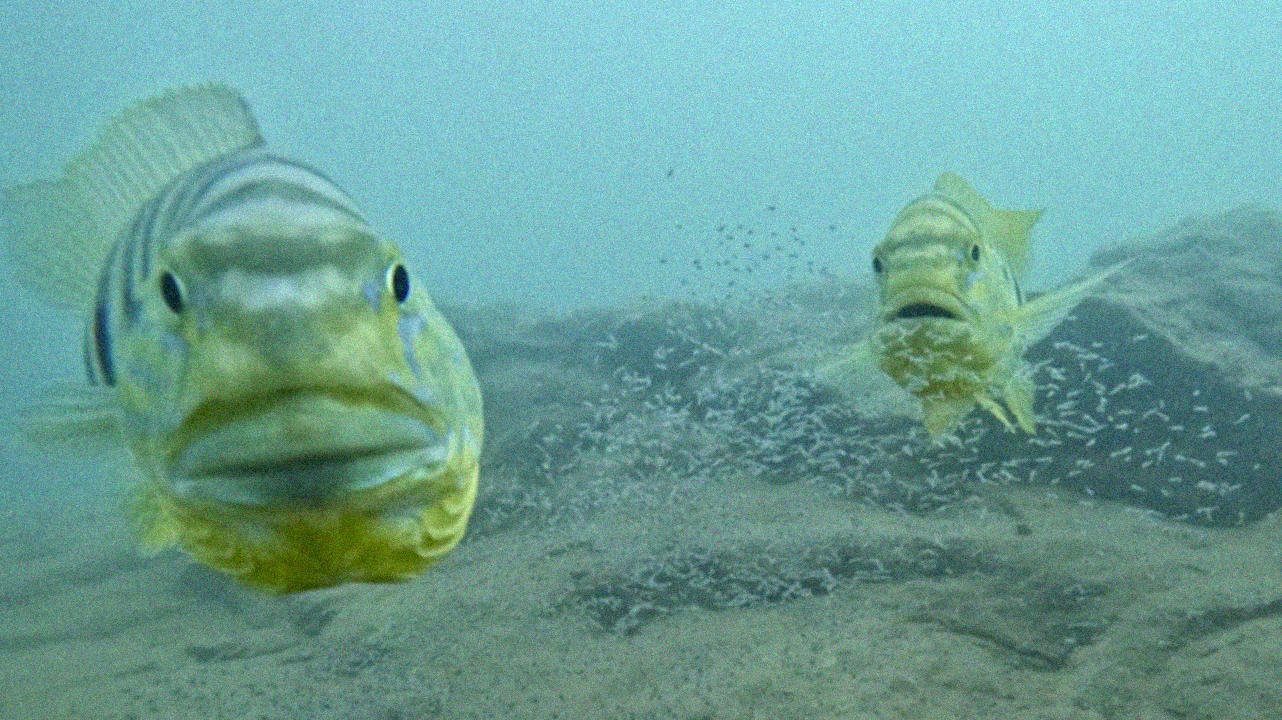 Самець (зліва) і самиця цихлід в оточенні мальків. Оскільки експериментатор дивився на них і потомство, обидві риби демонстрували агресію, піднімаючи зяброві кришки. Satoh et al. / Royal Society Open Science, 2026