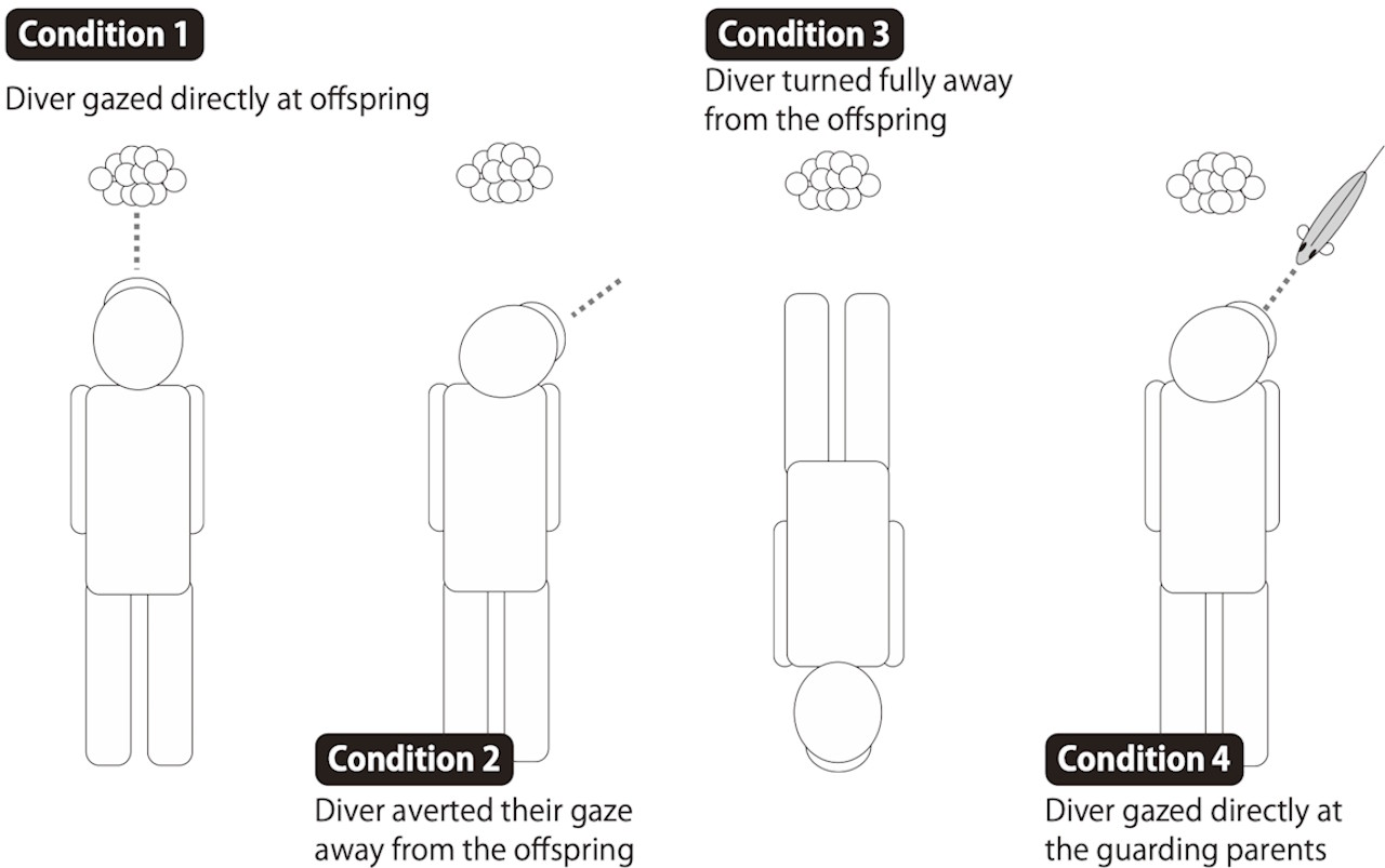 В експерименті науковці дивилися в чотири різні боки: на кладку ікри, вбік, у зворотній від кладки бік і на батьків, що охороняли кладку. У першому й останньому випадках це викликало в риб агресію. Satoh et al. / Royal Society Open Science, 2026