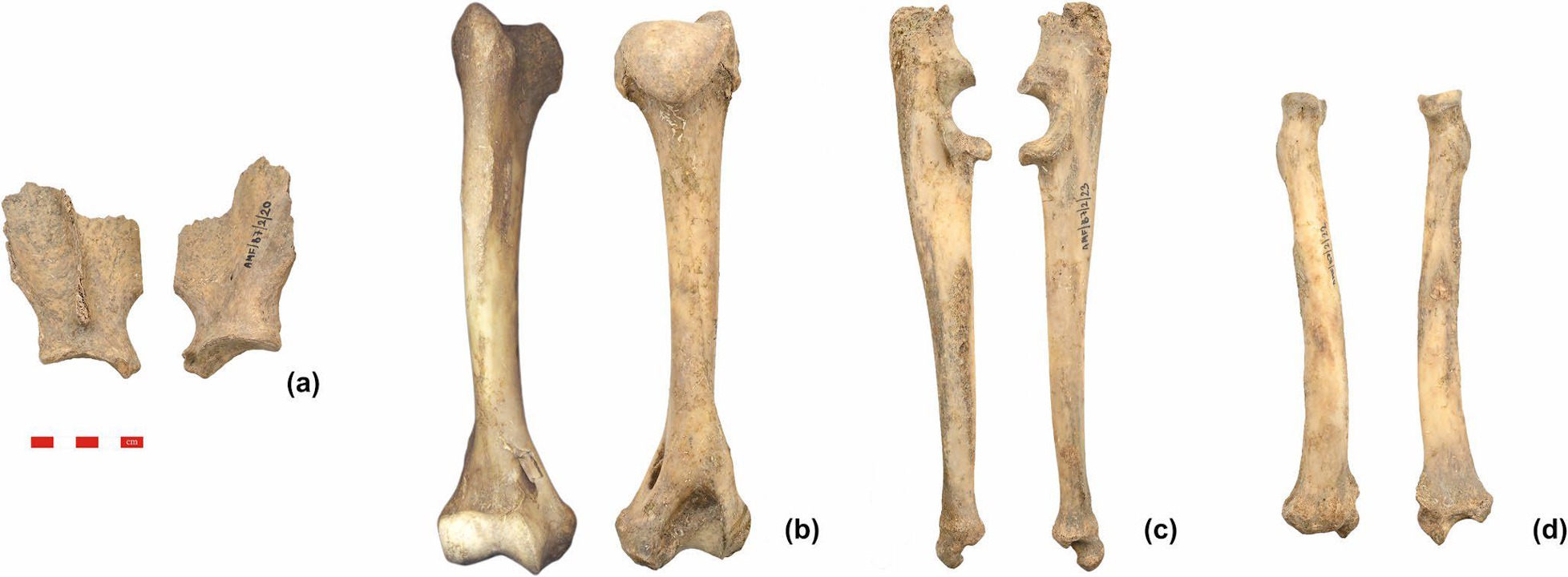 Фрагмент лопатки (a), плечова (b), ліктьова (c) і променева кістка (d) леопарда з Сербії. Vuković et al. / Archaeological and Anthropological Sciences, 2025