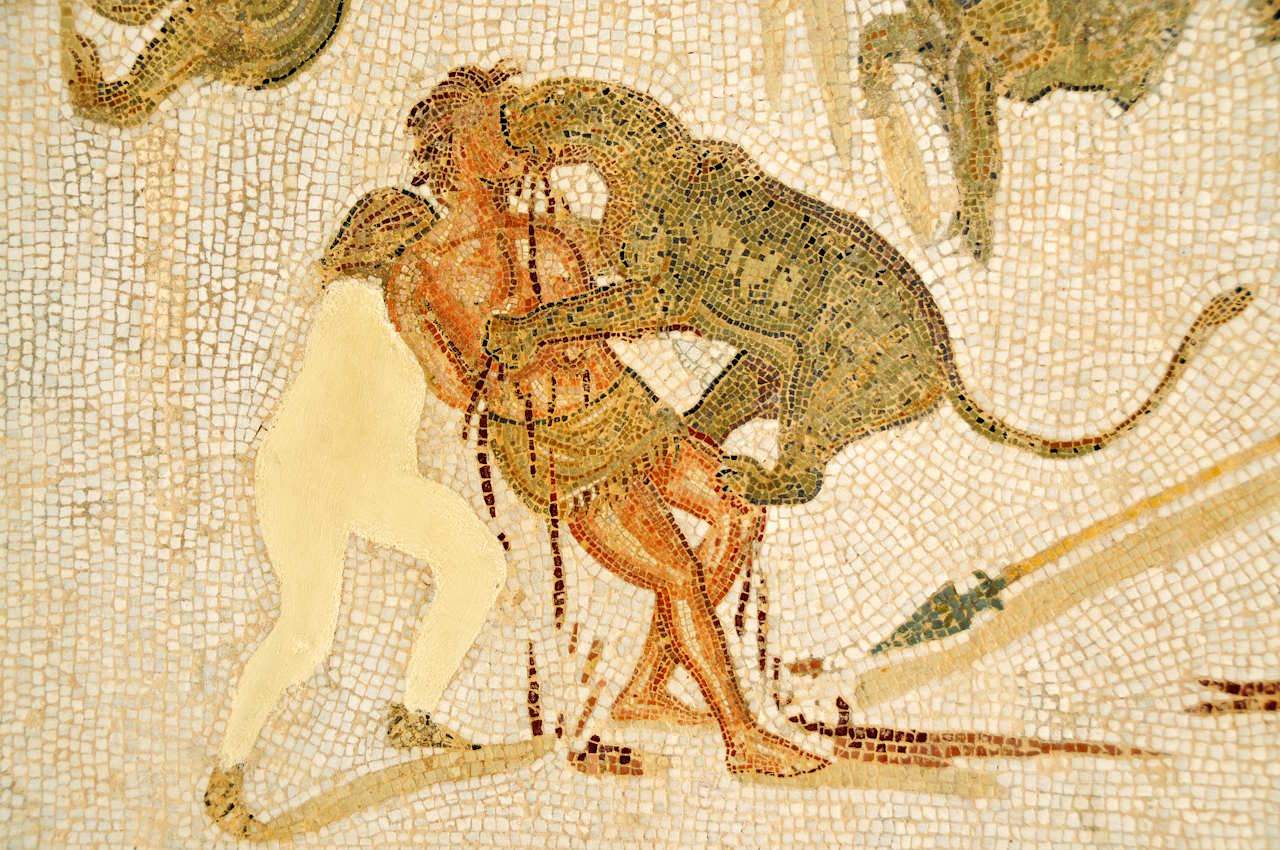 Фрагмент римської підлогової мозаїки, що зображає смерть людини на гладіаторській арені від нападу леопарда, з музею в Тунісі. Dennis Jarvis / Flickr