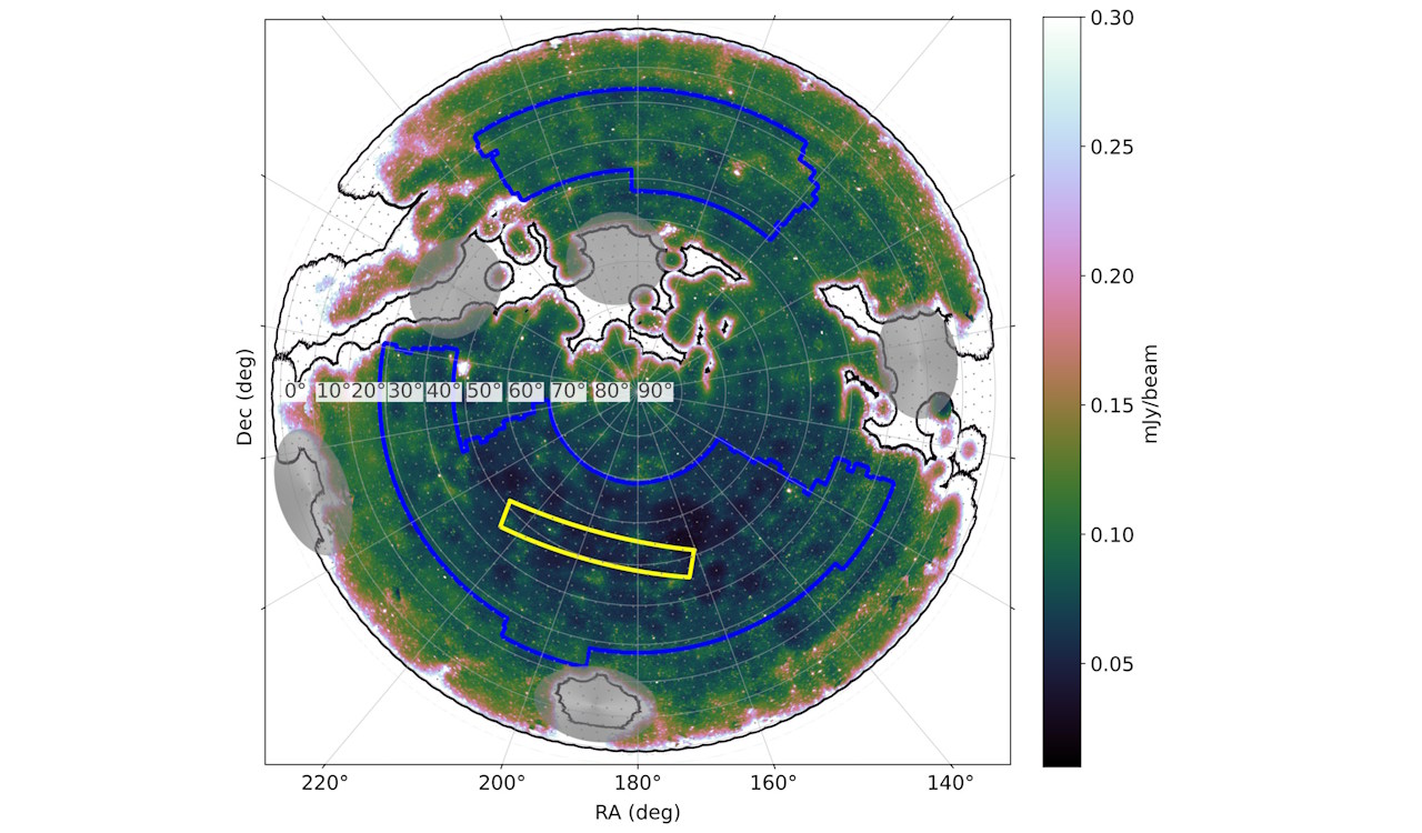 Блакитним і жовтим позначені ділянки північного неба, які наносили на попередні мапи, а чорним контуром обведено покриття у новій карті. Shimwell et al. / Astronomy&Astrophysics, 2026
