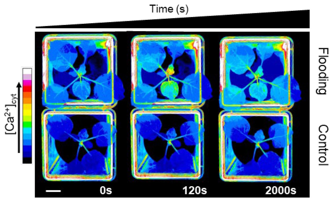 У відповідь на підтоплення (верхній ряд) в тютюну зафіксували хвилі кальцію, які видно за зміною кольору світіння з синього на зелений і навіть помаранчевий, порівняно з контрольними рослинами (нижній ряд). Tortora et al. / Science Advances, 2026