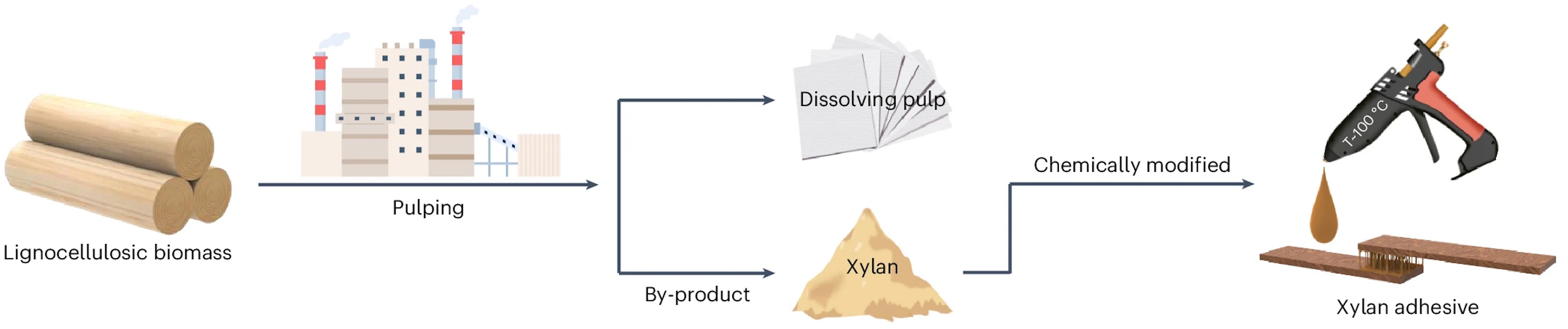 Процес отримання клею з деревини. Під час перероблення деревини на деревну масу, яку використовують для виготовлення паперу, утворюються побічні продукти ксилани, з яких хіміки й зробили клей, що можна використовувати в клейових пістолетах. Lv et al. / Nature Sustainability, 2025