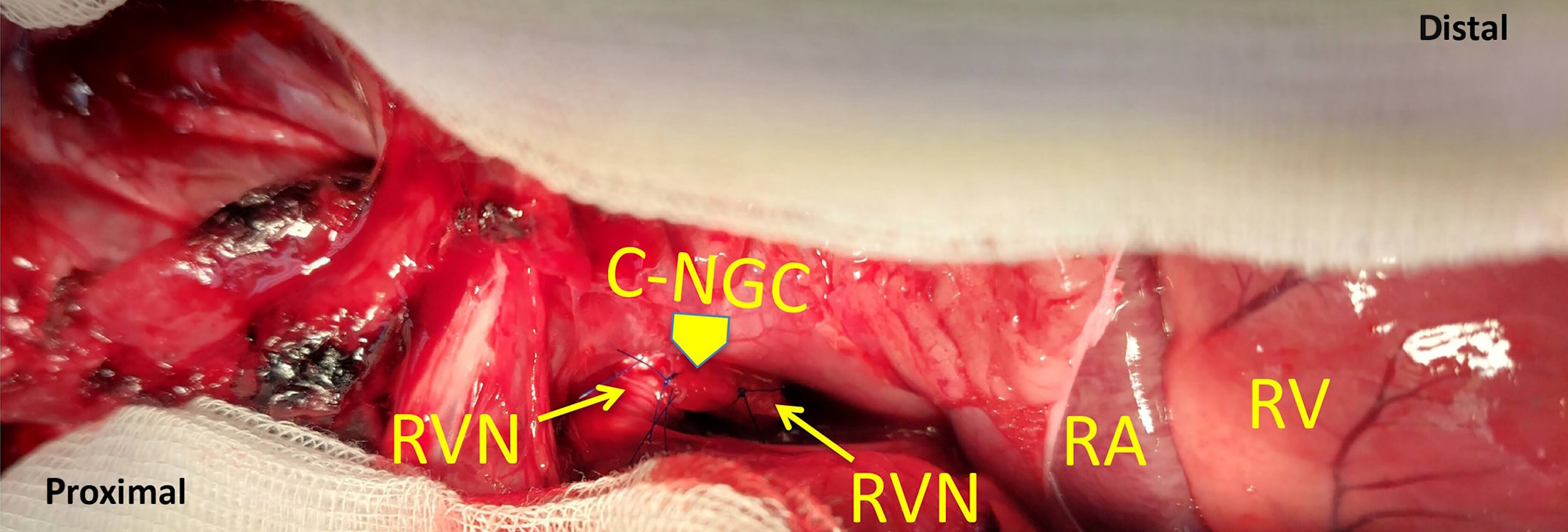 Оболонка з біорозкладного полімеру (C-NGC) на правій гілці блукаючого нерва (RVN) мініпігів. Dushpanova et al. / Science Translational Medicine, 2025