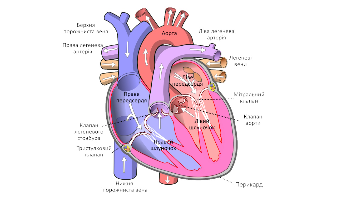 Схема будови серця з двома півмісяцевими клапанами — аорти та легеневого стовбура. Yaddah / Wikimedia Commons