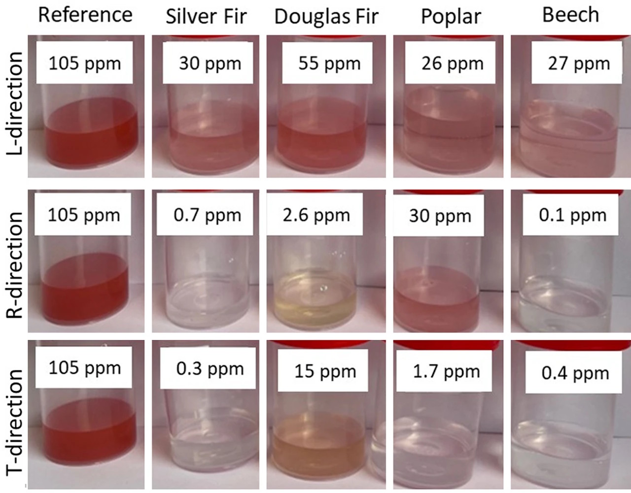 Здатність фільтрів з різної деревини видаляти з води наночастинки. Зліва направо: вода з наночастинками без фільтрації, після фільтрації крізь деревину смереки, дуґласії, тюльпанового дерева та бука. Згори вниз: повздовжній, кільцевий і поперечний переріз деревини. Sánchez-Ferrer & Guerrero Parra. / Wood Science and Technology, 2025