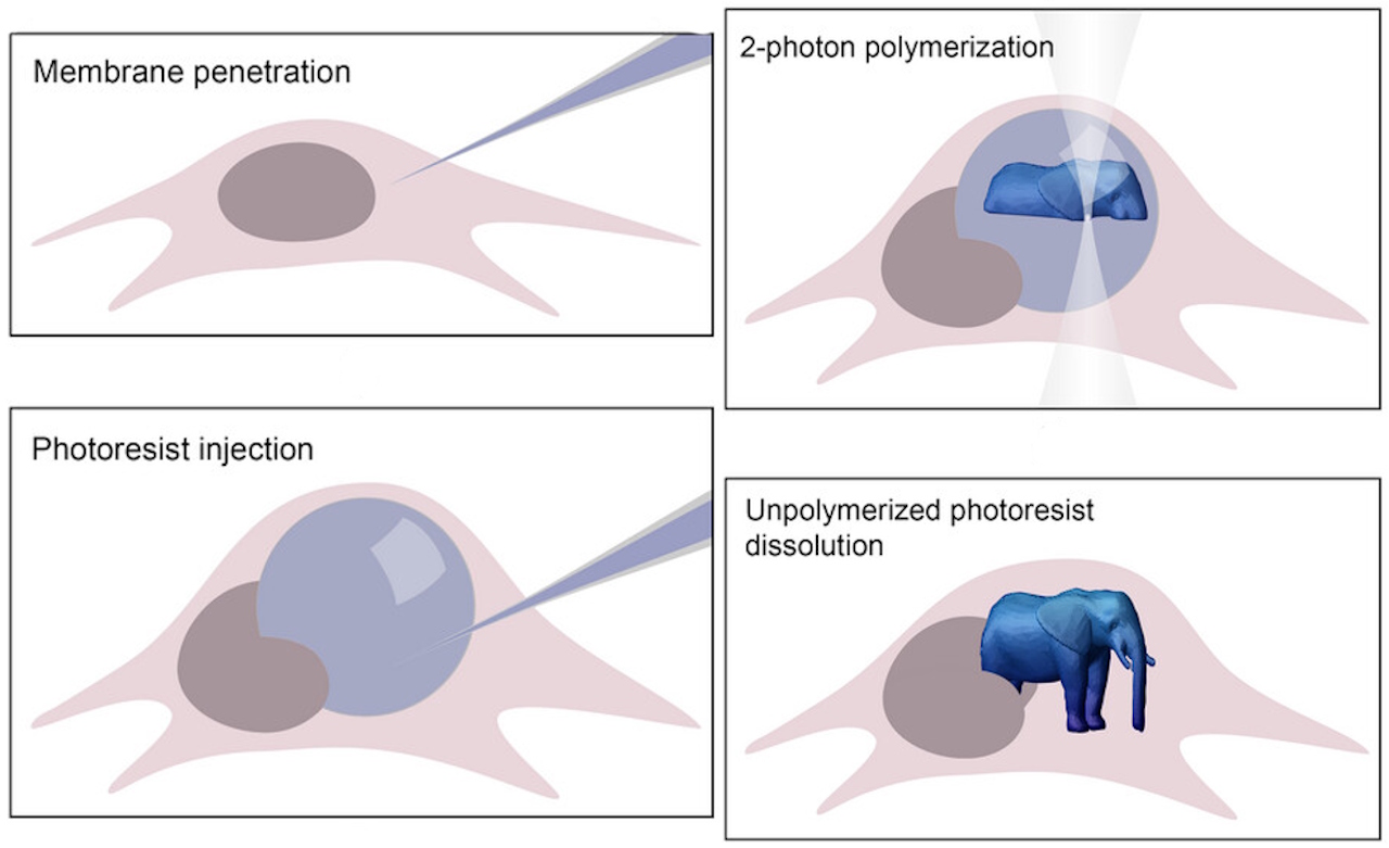 Фізики надрукували крихітні фігурки, зокрема 3D-слона, всередині живих клітин за допомогою вдосконаленого методу літографії, який застосовують у біомедицині та для створення надточних аналізаторів рідин. Здатність друкувати в живих клітинах може знайти застосування в доставці ліків до окремих тканин, виявлення патологій на клітинному рівні та біоелектроніки. Дослідження опублікували в журналі Advanced Materials.