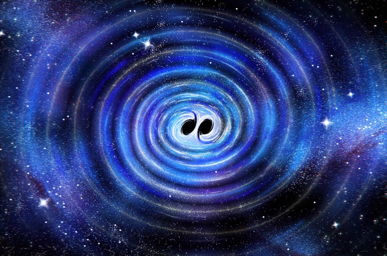 Художнє зображення гравітаційних хвиль, що утворилися внаслідок зіткнення двох чорних дір. MAGGIE CHIANG / SIMONS FOUNDATION