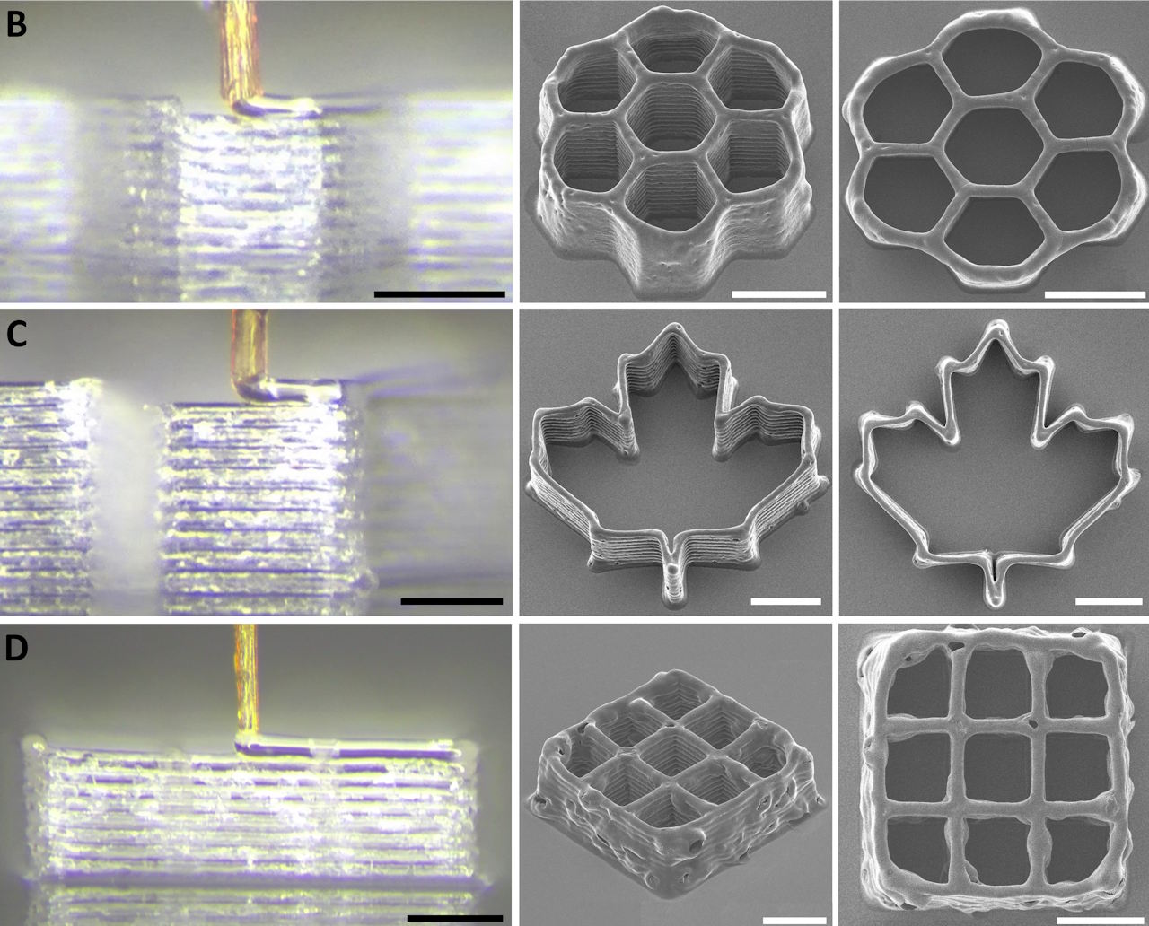 Три форми, які надрукували за допомогою хоботка комара: бджолині стільники (B), кленовий листок (C) і решітка з біочорнила з додаванням ракових клітин (D). Puma et al. / Science Advances, 2025