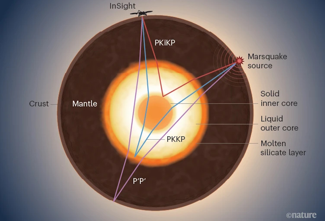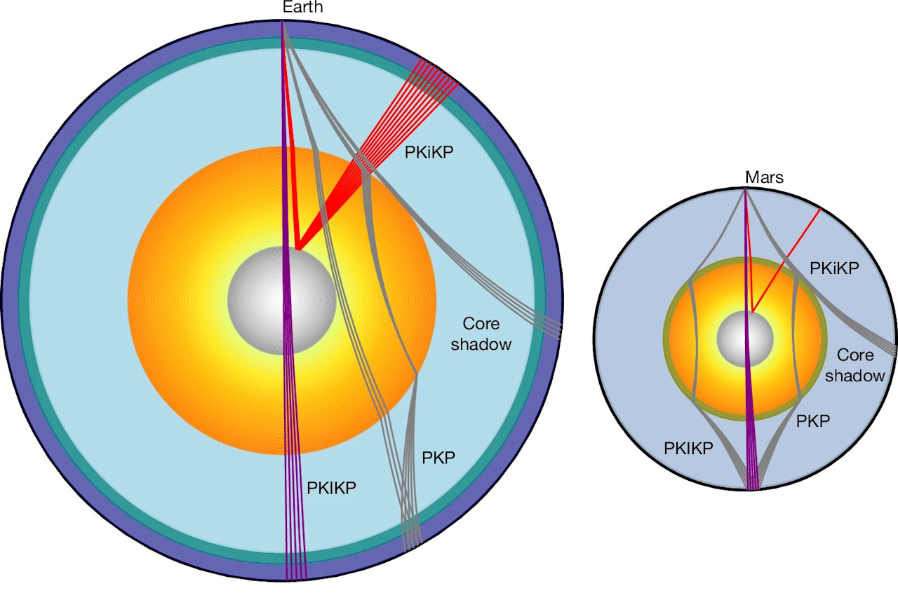 Ілюстрація того, як за проходженням сейсмічних хвиль крізь планету апарат InSight допоміг виявити тверде ядро Марса. Nature