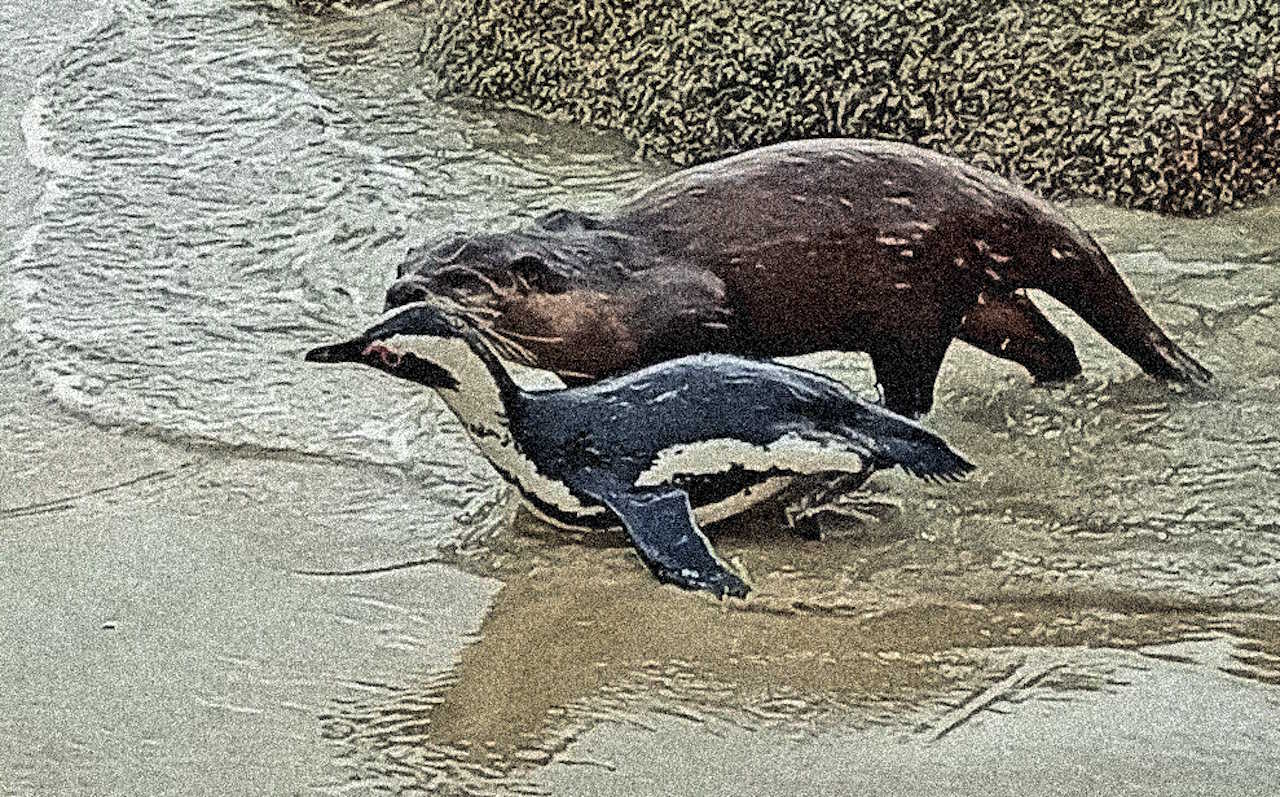 Капська видра атакує дорослого африканського пінгвіна на узбережжі Саймонстауна, ПАР. Albert Snyman / Ostrich. 2025