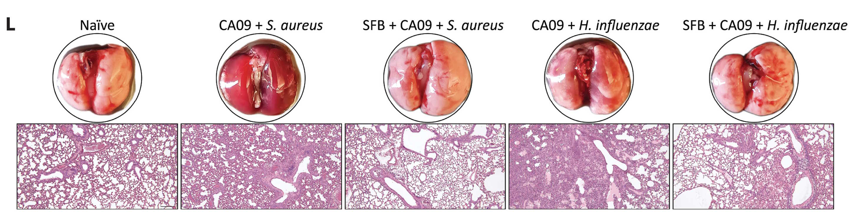 Фото легень мишей і їхні тканини під мікроскопом: здорові особини (перші зліва), заражені вірусом грипу і бактерією Staphylococcus aureus (другі), заражені вірусом і S. aureus, яким ввели кишкові бактерії (треті), заражені вірусом грипу і бактерією Haemophilus influenzae (четверті) та заражені вірусом і H. influenzae, яким ввели кишкові бактерії (п'яті зліва). Кишкові бактерії захищали тканини від запалення та руйнування. Ngo et al. / Science Immunology, 2026