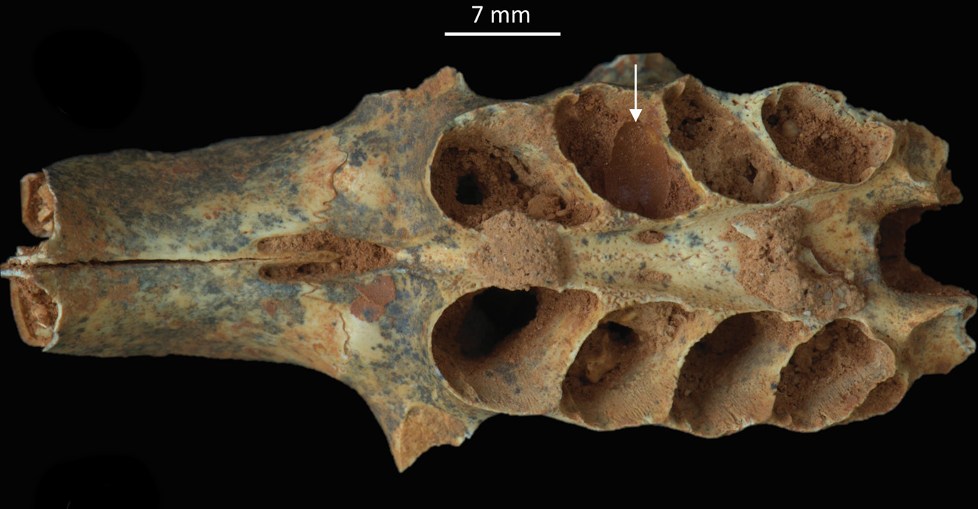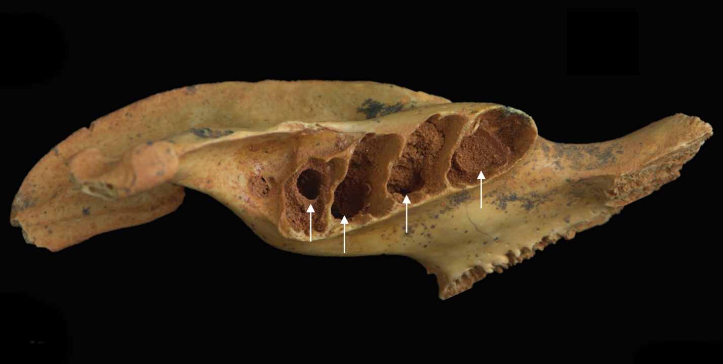 Отвори в щелепі гризуна, у яких гніздилися бджоли (позначені білими стрілками). Viñola-López et al. / Royal Society Open Science, 2025