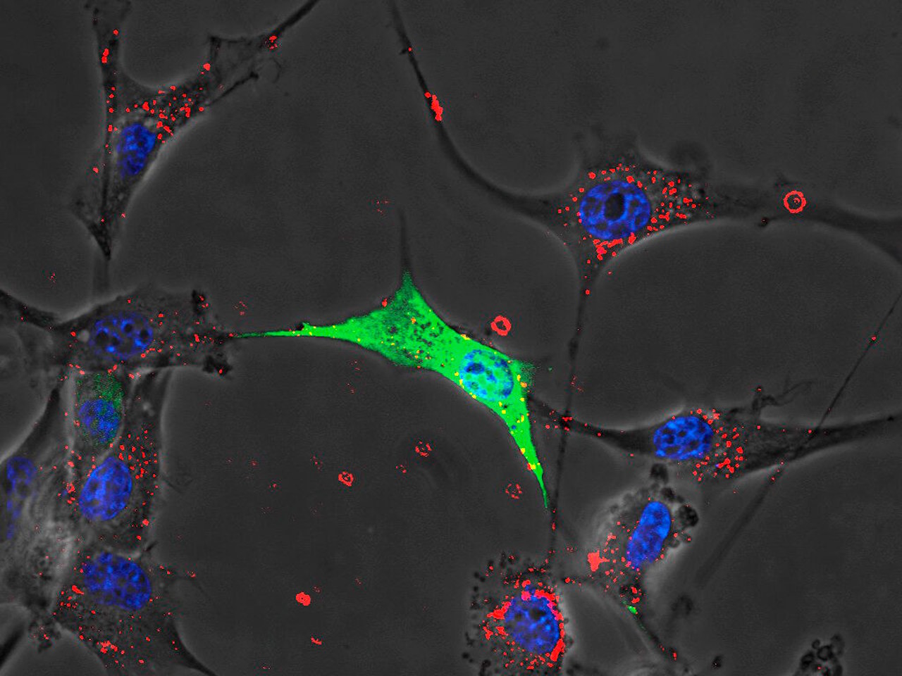 Знімок клітин гліобластоми за допомогою флуоресцентної та фазово-контрастної мікроскопії. Alex Gray / Wellcome Collection