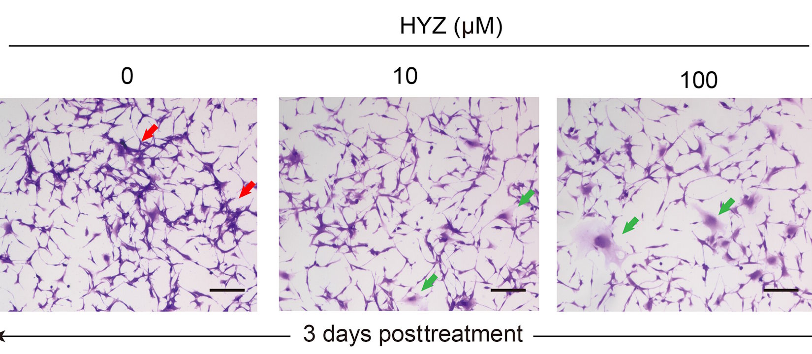 Ріст клітин гліобластоми за 3 дні після введення гідралазину в різних концентраціях: 0, 10 і 100 мікромолів. Shishikura et al. / Science Advances, 2025