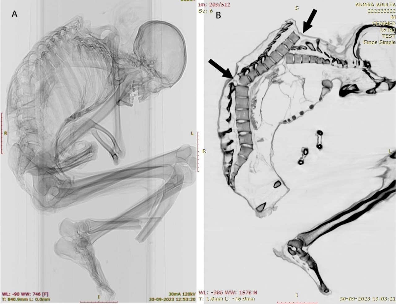 Рентгенівський знімок і комп'ютерна томографія решток, на яких видно травми хребта чоловіка. Morales & Garrido / International Journal of Osteoarchaeology, 2025