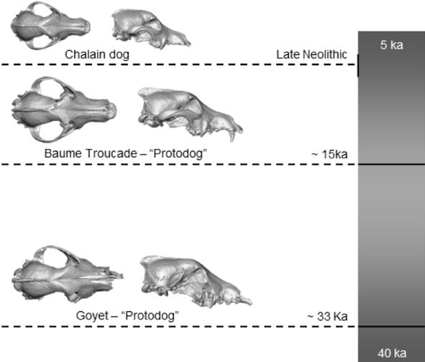 Порівняння розмірів черепів частково одомашнених собак віком 33 і 15 тисяч років і повністю одомашнених собак віком 5 тисяч років. Cucchi et al., 2025