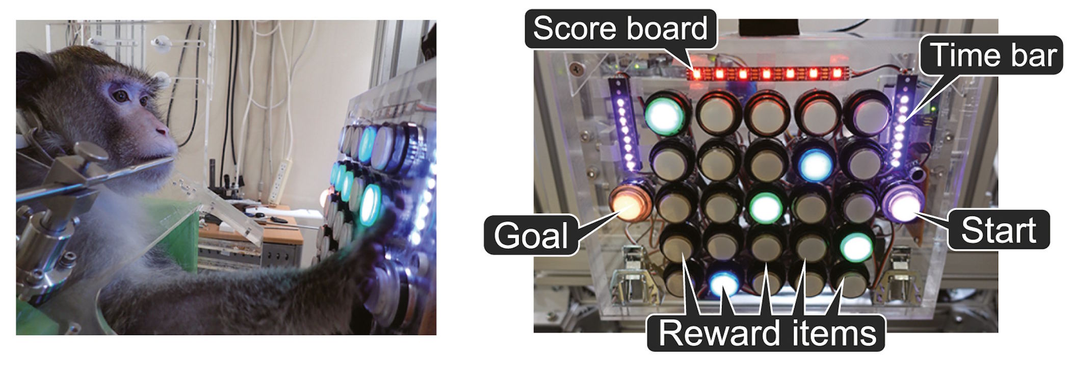 Дослідження проводили на двох самцях видів крабоїдний макака (Macaca fascicularis) і японський макака (Macaca fuscata). Для них побудували пристрій, у якому потрібно було натискати на кнопки, щоб почати експеримент, обрати винагороду та закінчити. Винагородою був різний об’єм води, адже протягом дня макаки мали до неї обмежений доступ. Макаки отримували винагороду лише тоді, коли встигали натиснути на кнопку для завершення експерименту до того, як сплине часовий ліміт.