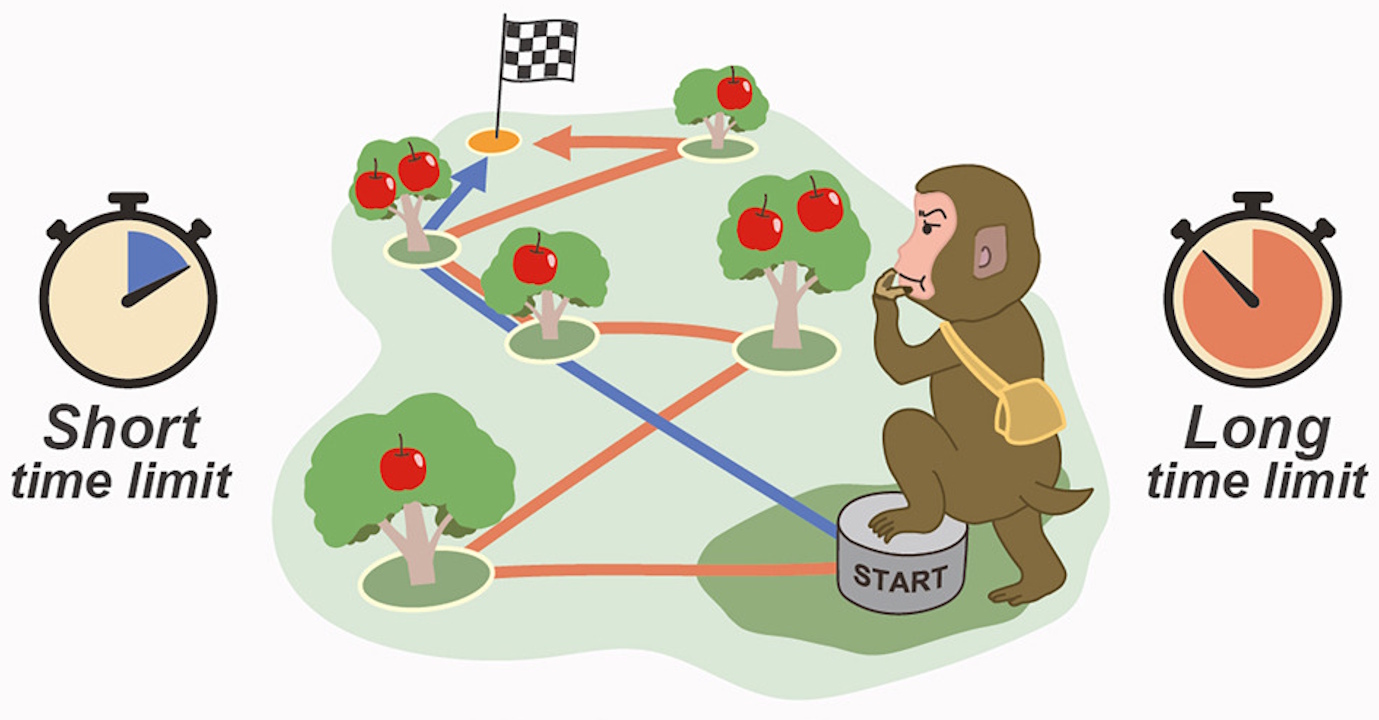 Схема того, як діяли макаки у випадку нестачі часу (обирали більш прямий шлях, позначений синім) і у випадку, коли мали вдосталь часу (забирали всі винагороди, позначений помаранчевим шлях). Ishii et al. / Current Biology, 2025