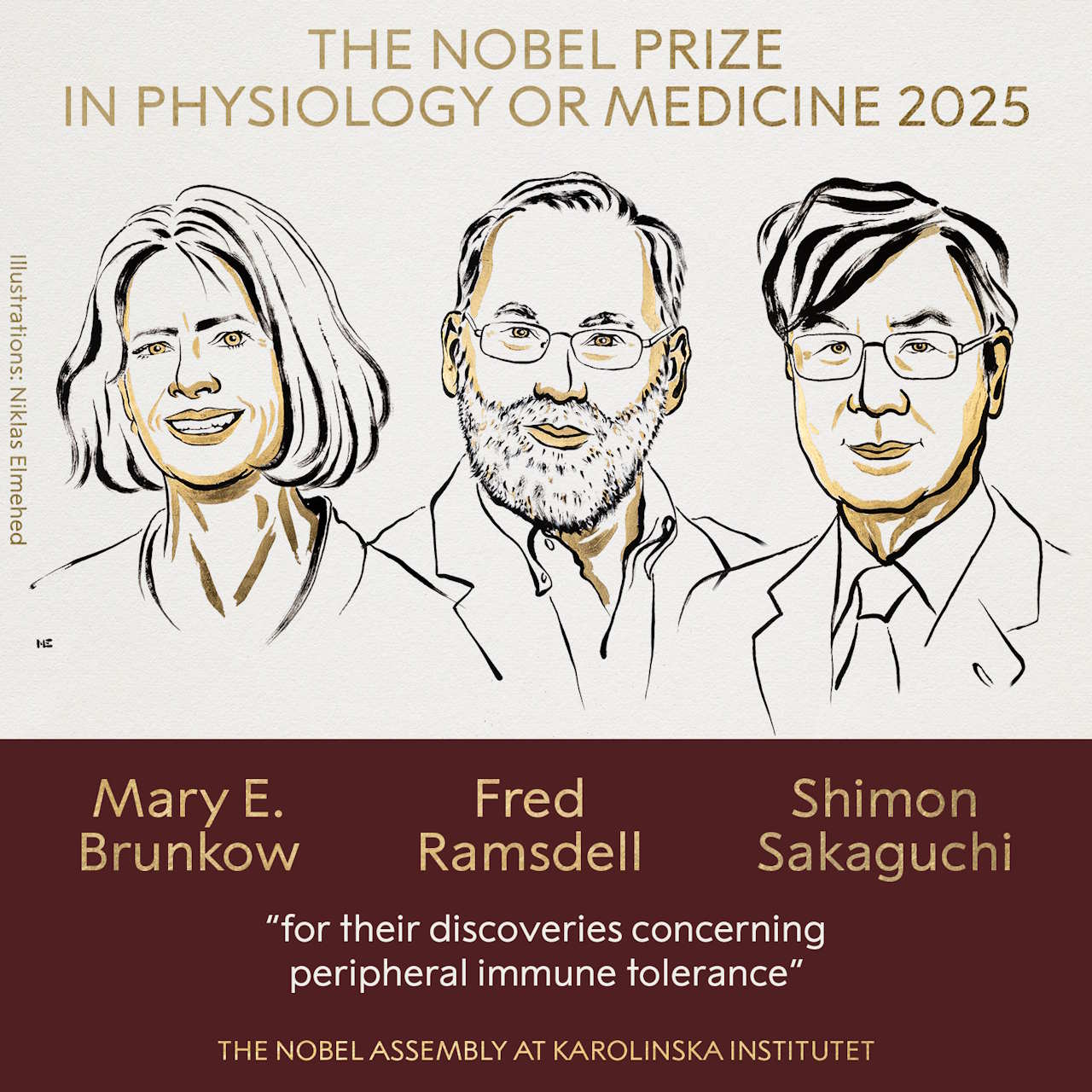 Шведська королівська академія наук присудила Нобелівську премію з фізіології чи медицини у 2025 році Мері Бранков (Mary E. Brunkow), Фреду Рамсделлу (Fred Ramsdell) та Шимону Сакаґучі (Shimon Sakaguchi) за дослідження толерантності периферичної ланки імунітету. Це відкриття допомогло пояснити, як імунна система тварин зберігає здатність реагувати на збудники хвороб, не пошкоджуючи при цьому клітини власного організму. Лауреатів оголосили під час онлайн-трансляції на сайті Нобелівської премії.