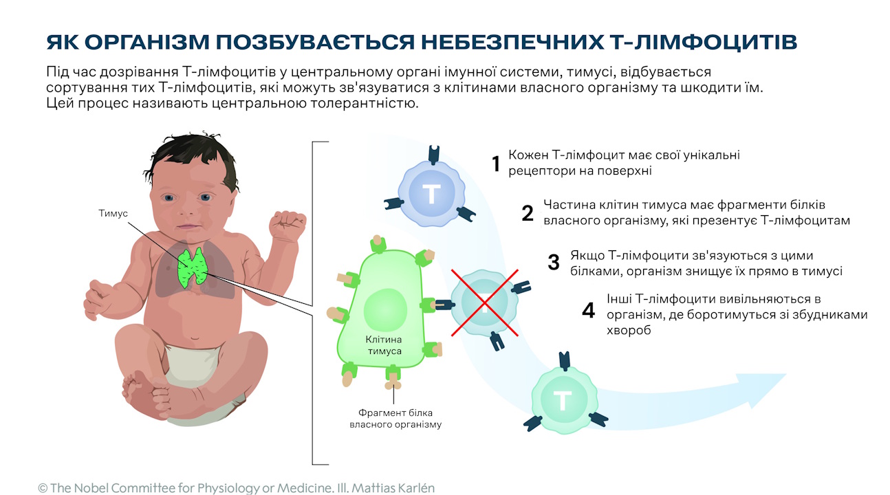 Премію з фізіології чи медицини присудили за розширення розуміння явища толерантності імунітету. Толерантністю називають здатність імунних клітин вибірково не реагувати на певні антигени — молекули на поверхні клітин, за якими імунна система розрізняє «свої» та «чужі» клітини. Раніше науковці вважали, що толерантність виробляється лише після знищення патогенів у тимусі — одному з центральних органів імунної системи, тож таку толерантність називають центральною.