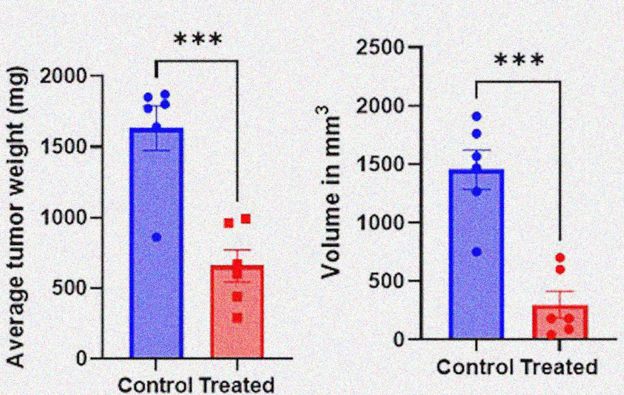 Після лікування BA-101 маса пухлин (графік зліва) і їхній об'єм (справа) були меншими, ніж у контрольній групі (синій стовпчик — контрольна група, червоний — лікована). Ojha et al. / Braine Medicine, 2026
