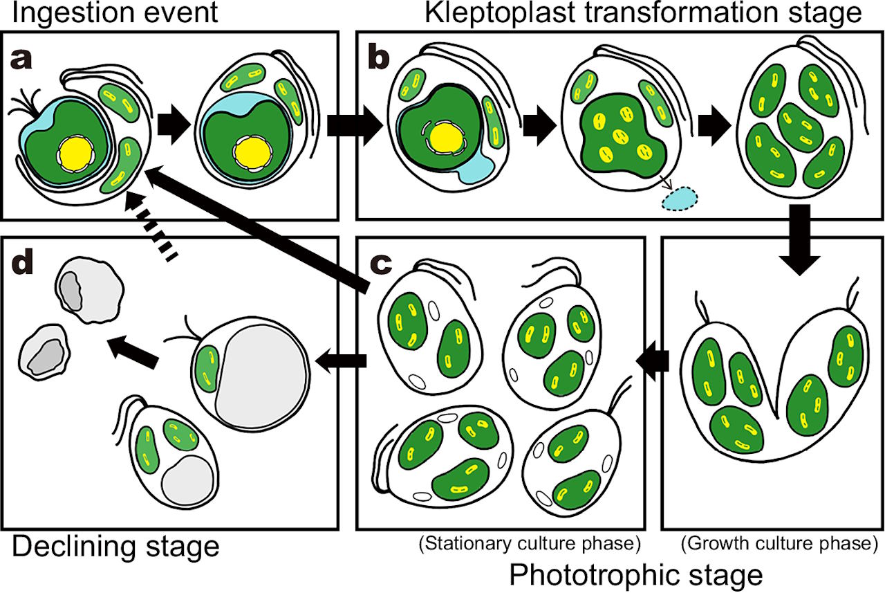 Схема життєвого циклу Rapaza viridis: поїдання водоростей Tetraselmis (a), поглинання їхніх хлоропластів і викидання ядра (b), поділ хлоропластів і використання їх для фотосинтезу (c), втрата робочих хлоропластів і пошук нових жертв (d). Kashiyama et al. / Nature Communications, 2026