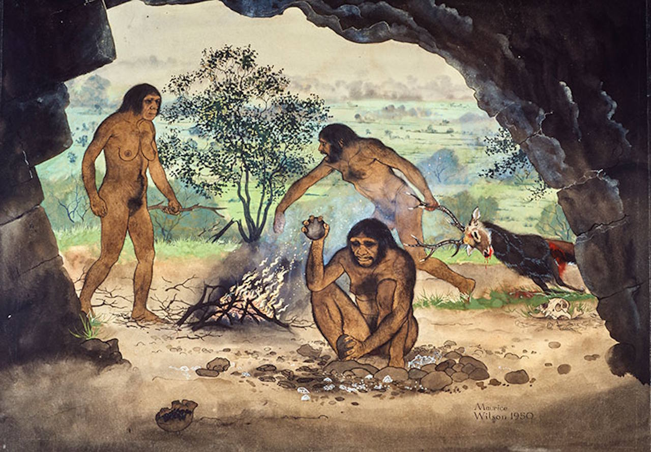 Художнє зображення добування вогню предками людини — людиною прямоходячою. Maurice Wilson / Natural History Museum