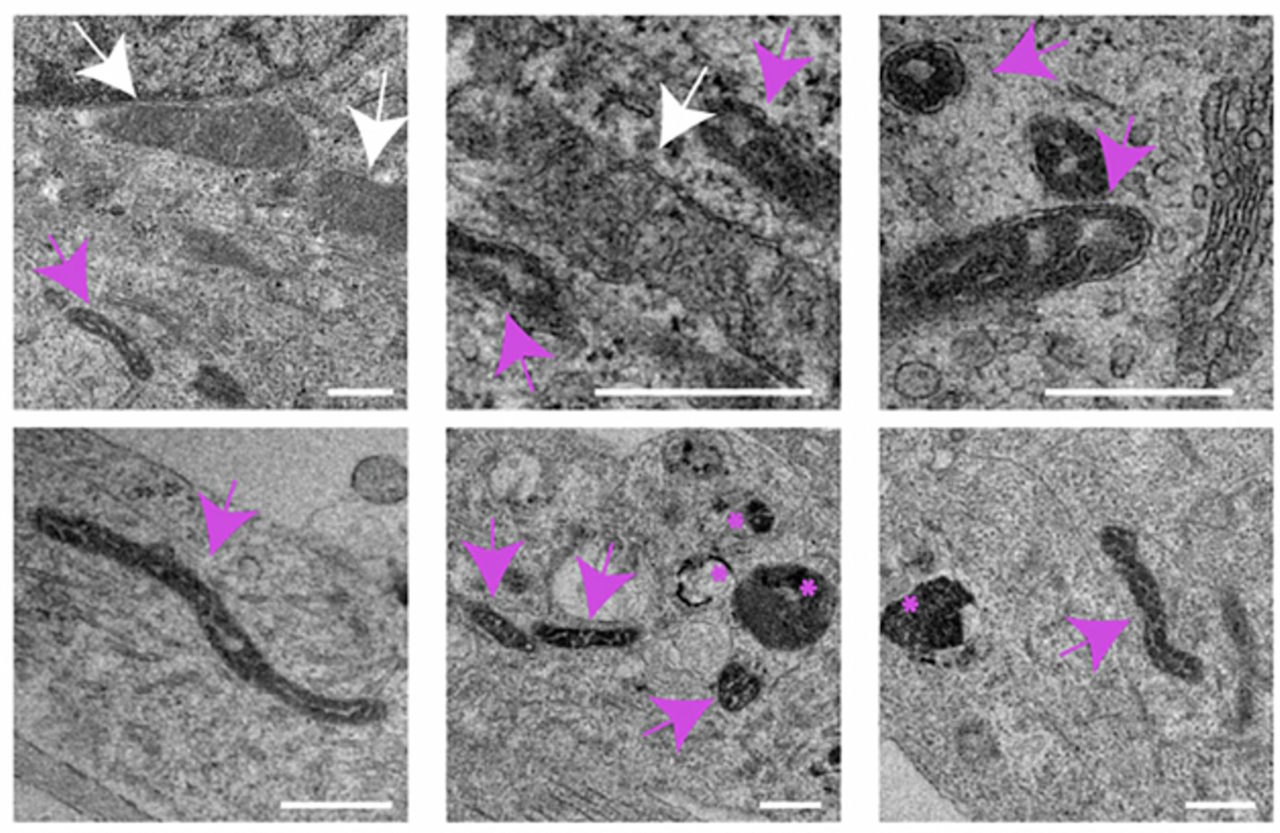 Власні мітохондрії клітини позначені білими стрілками, а пересаджені — бузковими, фото під трансмісійним електронним мікроскопом. Ayupov et al. / Nature, 2026