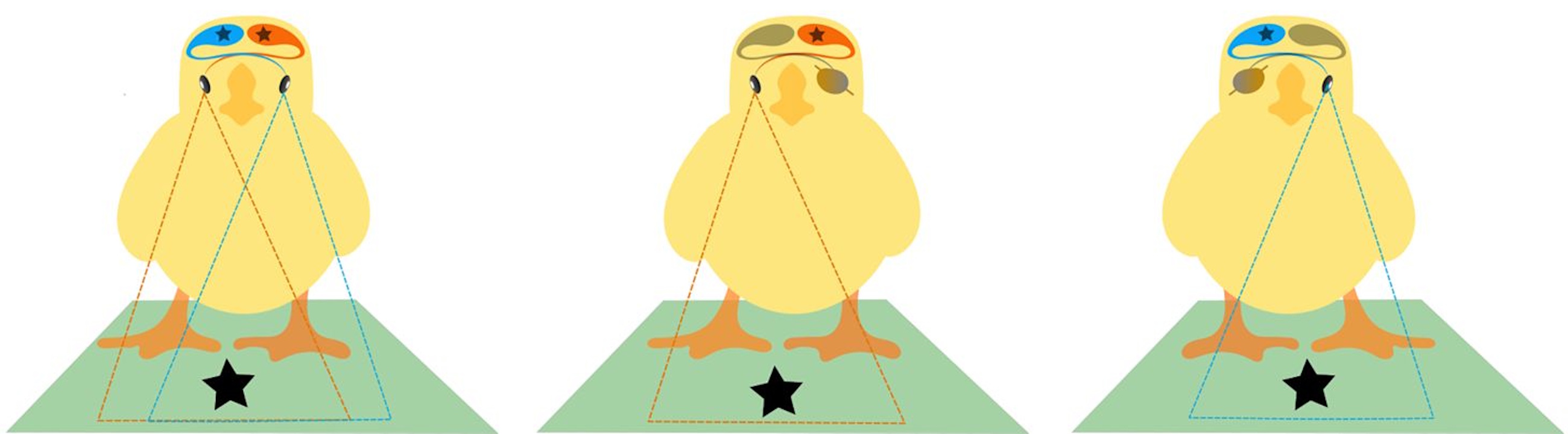 Ілюстрація того, як перевіряли здатність курчат рахувати, використовуючи обидва ока чи одне з них. Rugani et al. / eLife, 2025