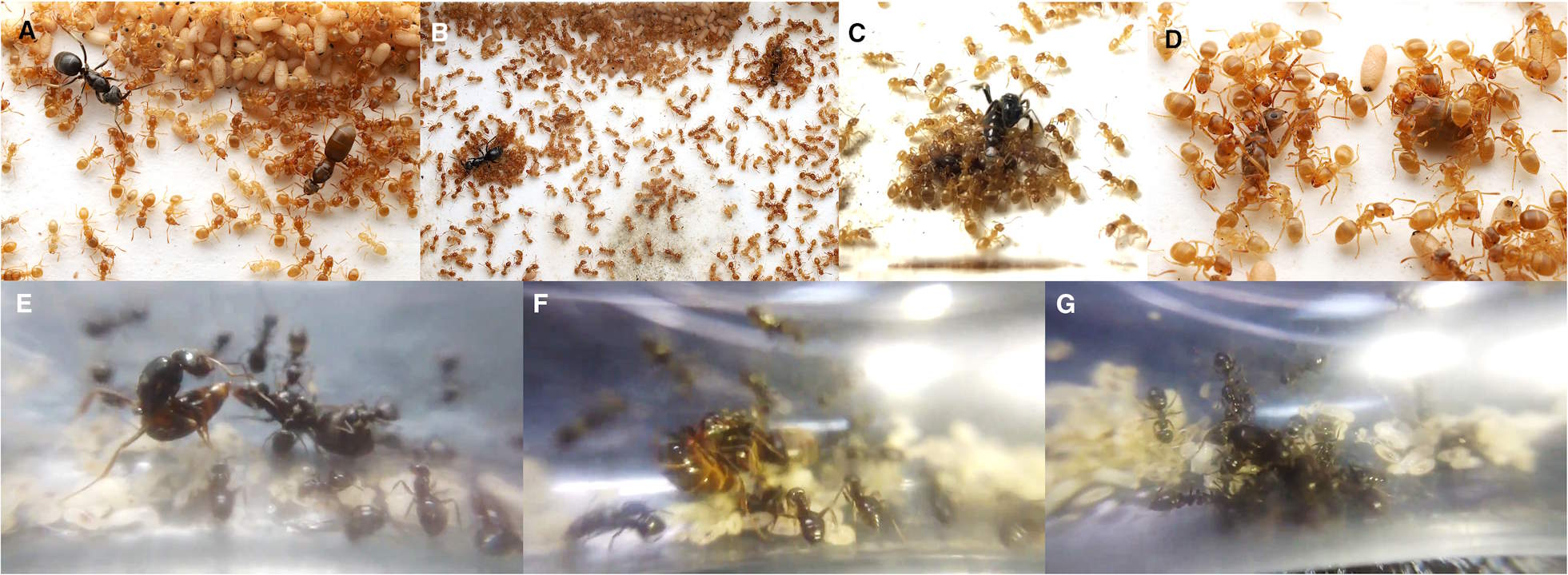 Послідовність маніпуляцій паразитичної мурахи для захоплення колоній. Верхній ряд: королева L. orientalis проникає в гніздо та обприскує королеву L. flavus, після чого її власні діти розривають королеву-хазяйку. Нижній ряд: королева L. umbratus повторює ті ж дії з королевою L. japonicus, яку робочі особини вбивають. Takasuka et al. / Current Biology, 2025