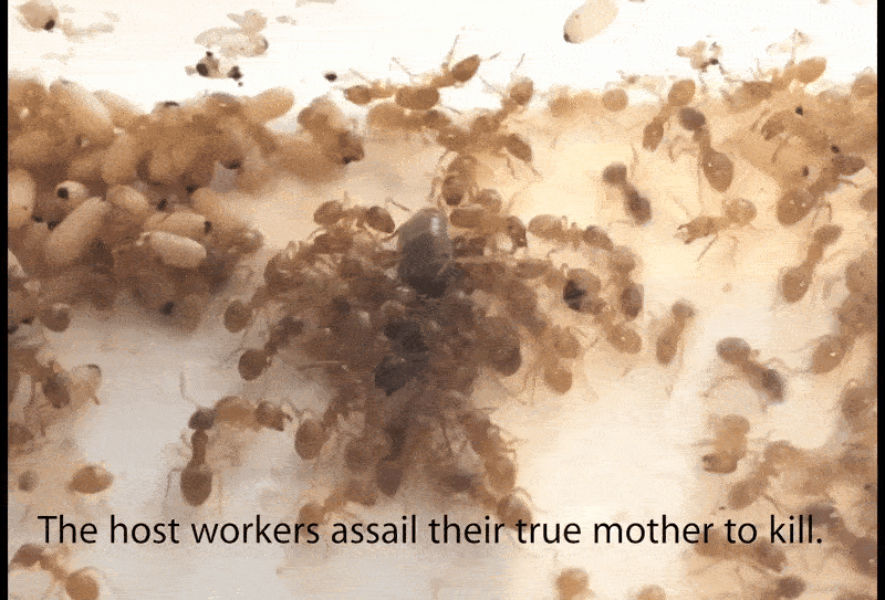 Паразитичні королеви мурах змусили мурах-робітників вбити їхню королеву-матір, інтегрувавшись у колонію і використовуючи хімічні сигнали. Дослідники вперше задокументували, як паразитична королева обприскує господарку секретом, який миттєво провокує агресію її дочок-робітників і призводить до матрициду — убивства королеви-матері. Такий механізм хімічного контролю дозволяє паразиту захопити владу в колонії й стати новою правителькою. Відкриття опублікували в журналі Curent Biology.